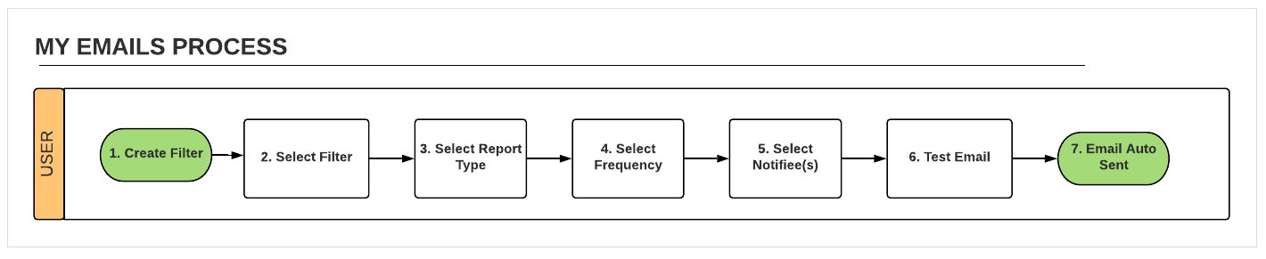 The My Emails function is available throughout Lucidity Software on any page where lists of records or information are available and can be filtered. There are several steps required in the process to ensure the emails work efficiently. See the steps and flow chart below for more information.