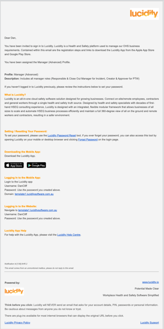 Access and HR notifications are disabled by default. Please lodge a support ticket to have these enabled on your site. This article details a list of the standard access/HR notifications available in Lucidity.
