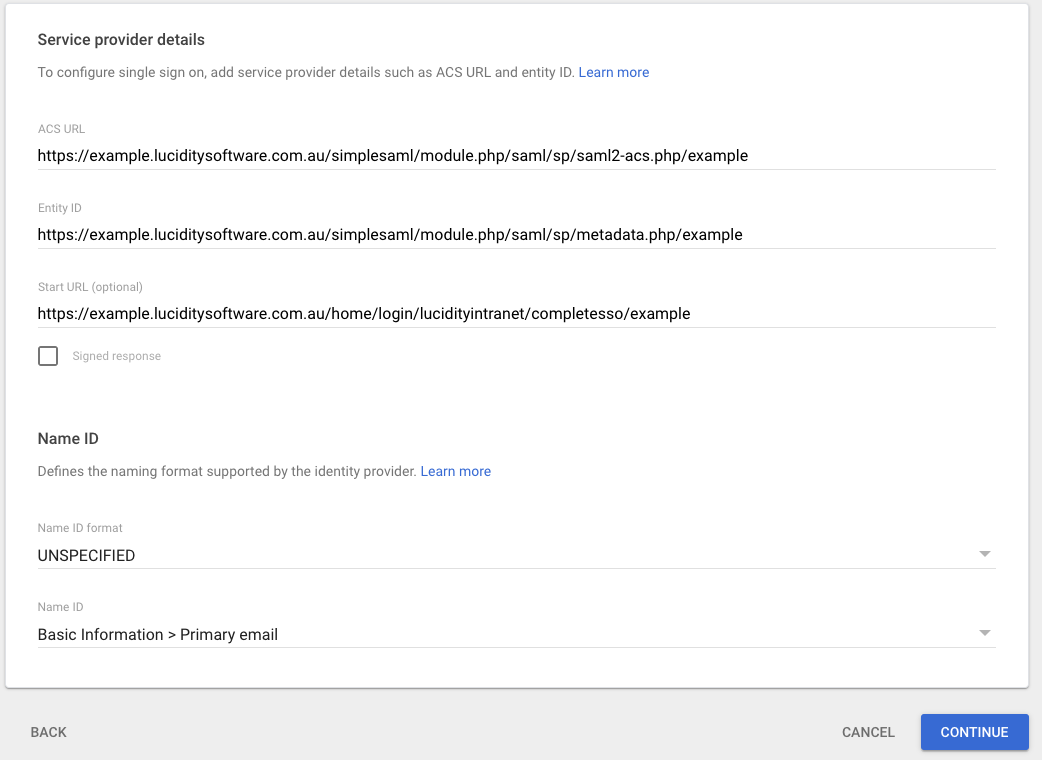 Note: Leave the Name ID format and Name ID values as default and replace {clientName} with your Lucidity instance's subdomain and {domain} with your Lucidity domain (luciditysoftware.com.au or lucidity.io).