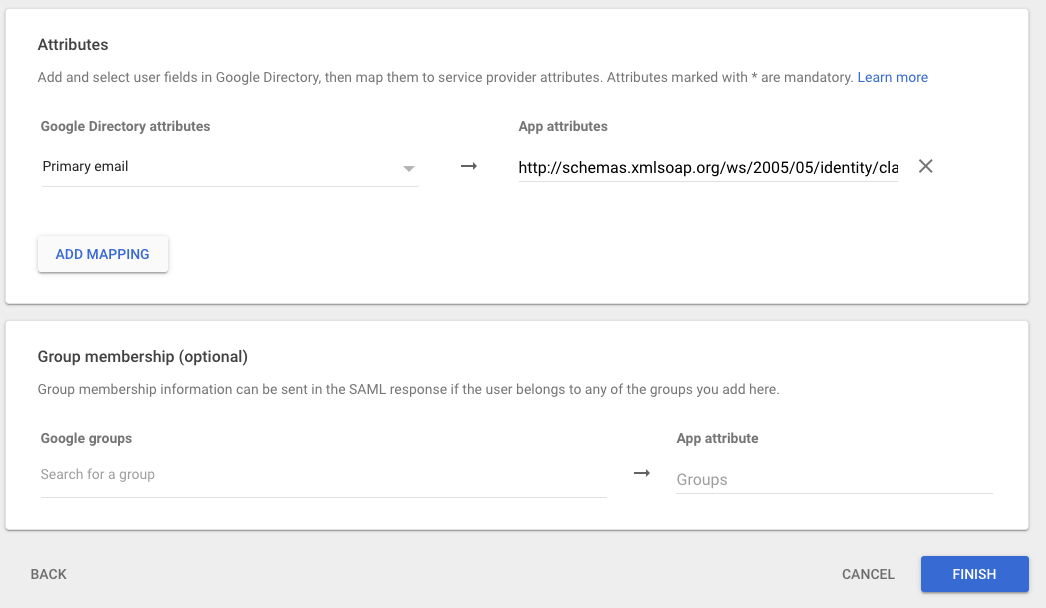 - Set App attributes to: http://schemas.xmlsoap.org/ws/2005/05/identity/claims/upn