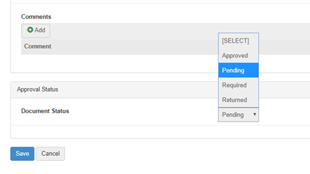 | Document Approval Status | Individual document status: Required, Pending, Approved, or Returned. |