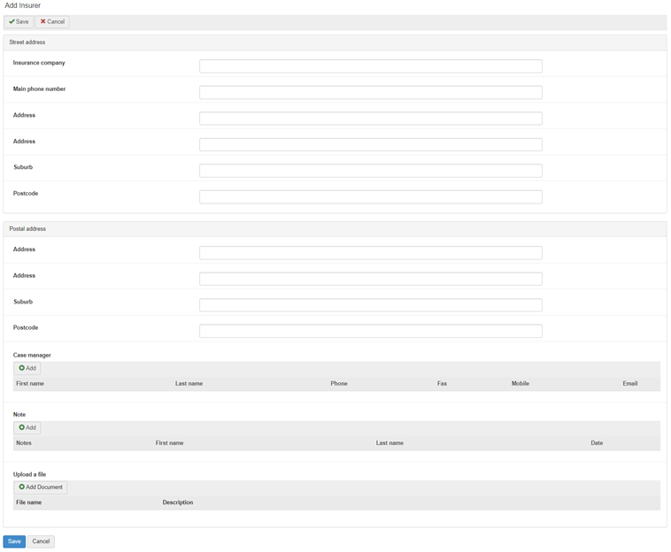 For each insurer, it is possible to nominate one or more case manager. The case managers will appear as options within each case once the corresponding Insurer is selected. |