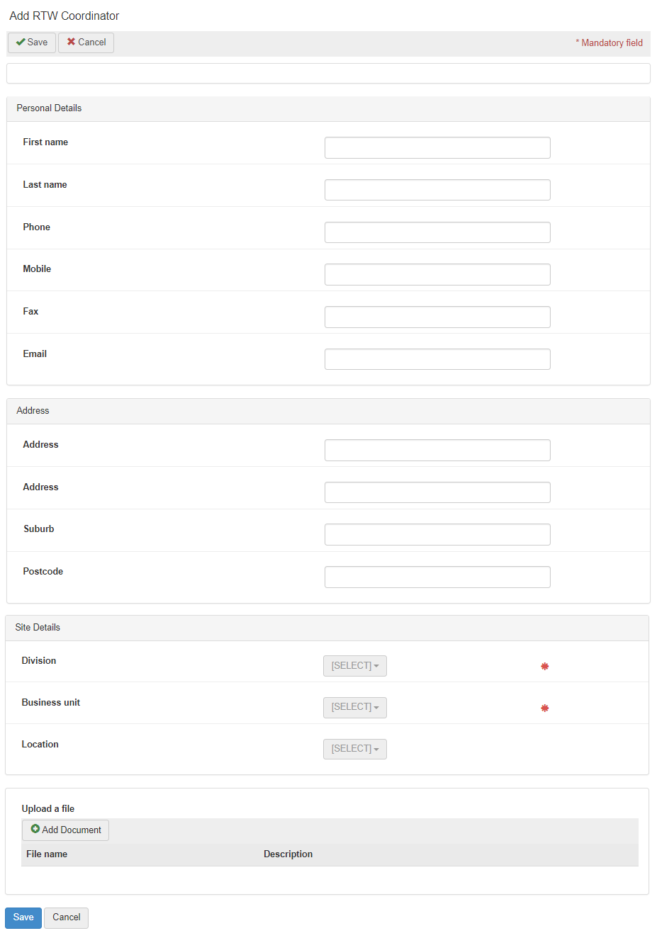 | Site Details | Select the site details the RTW coordinator is generally based at. This may include division, business unit, location etc. |