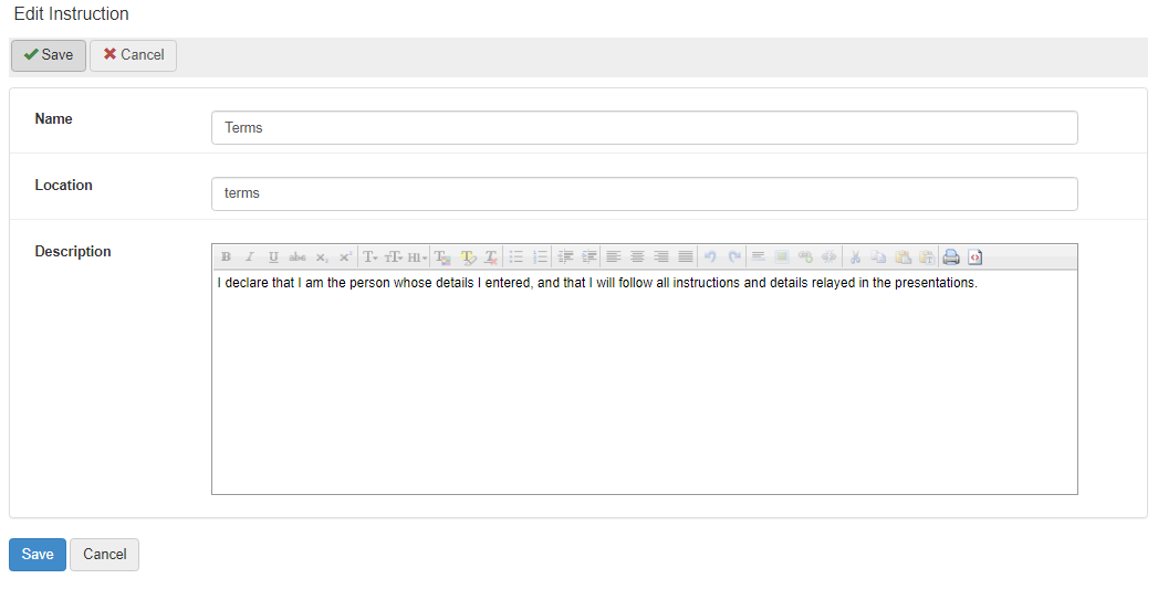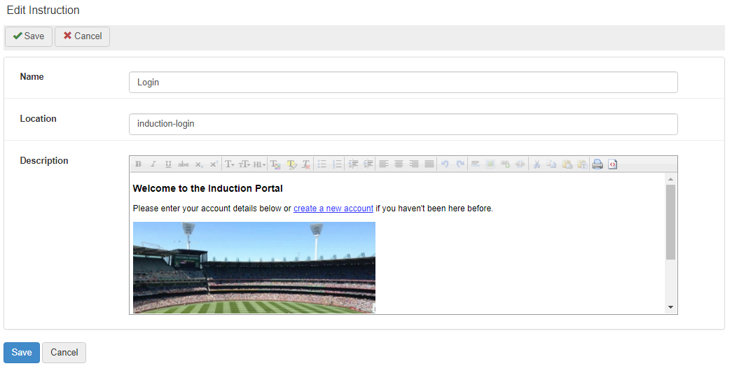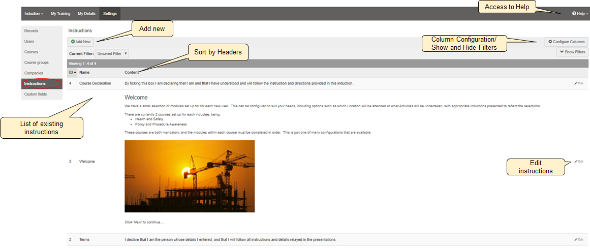 The Instructions page is where administrators can manage the instructions which are displayed in various locations throughout the system.
