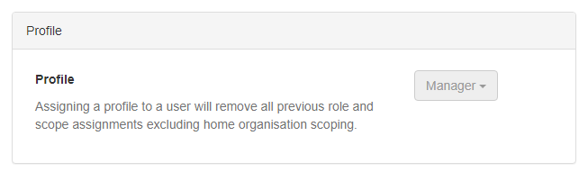 Assigning a profile to a user will remove all previous role and scope assignments excluding home organisation scoping.