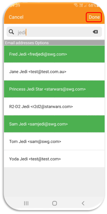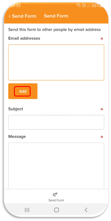 - To email to a user within the system, tap the Add button. Alternatively, type in the email address directly in the Email addresses field.