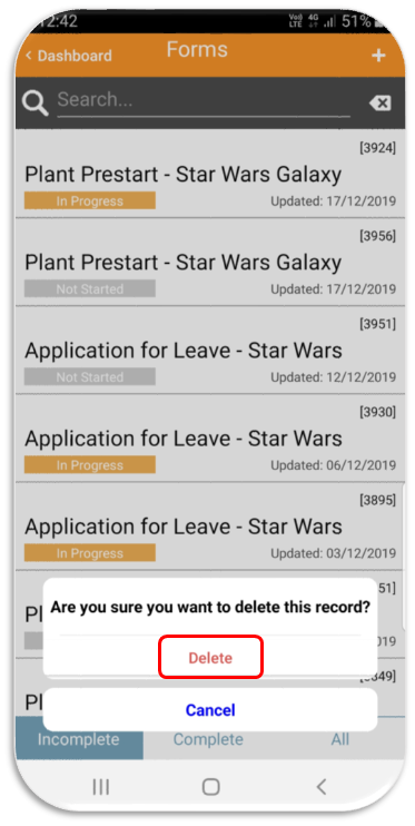 - Press and hold on the name of the form record to be deleted for Android devices or Swipe from the right edge of the form you’re trying to delete for iOS devices.
