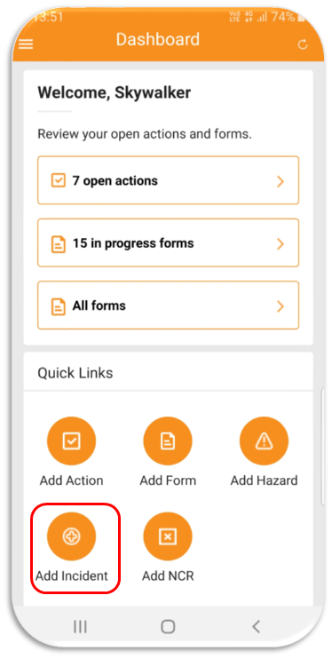 Currently, incident, non-conformance and hazard issue types can be entered via the App. The following explains how to enter an incident report but the steps are the same for any issue type.