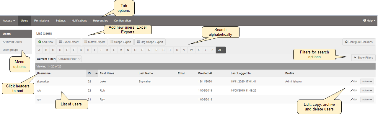 - Users: View, edit, archive and delete users including providing access to Lucidity modules.