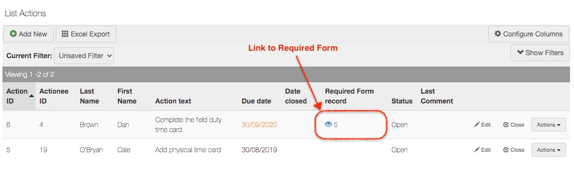 The presence and status of a required form can also be included in the My Actions or All Actions page using the Column Configuration tool. Filters on these pages indicate whether actions have an attached form, the status of the form, and which specific form is required.