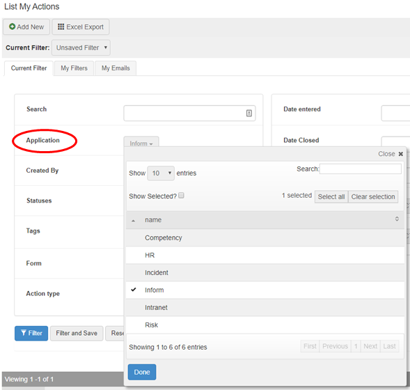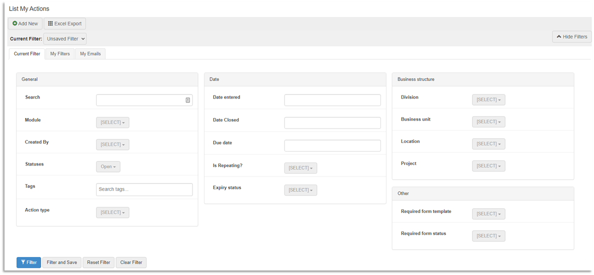 | Organisation (Project, Division) Filtering | The filters for organisations are based on the object that the action is linked to (Inform Record, Incident Issue, Risk etc). Using these filters will exclude actions that do not relate to entities associated to these org structures. As a side-effect, it will also filter out any ‘free-floating’ actions (are not tied to an Inform Record etc). |
