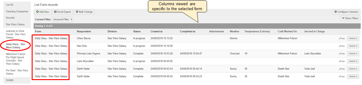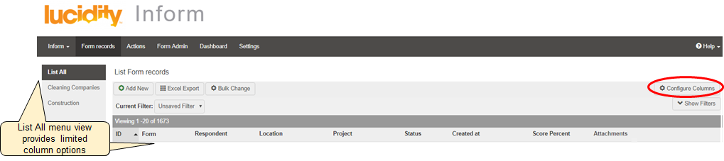 Column configuration can be managed from the List All menu and from individual form groups but only very limited column options are available as it is impossible to list all options for all form fields on a single page. Only basic options that are consistent throughout all forms, such as organisational structure, created date etc are available. Therefore, navigation to the individual form is required if specific columns require configuration.