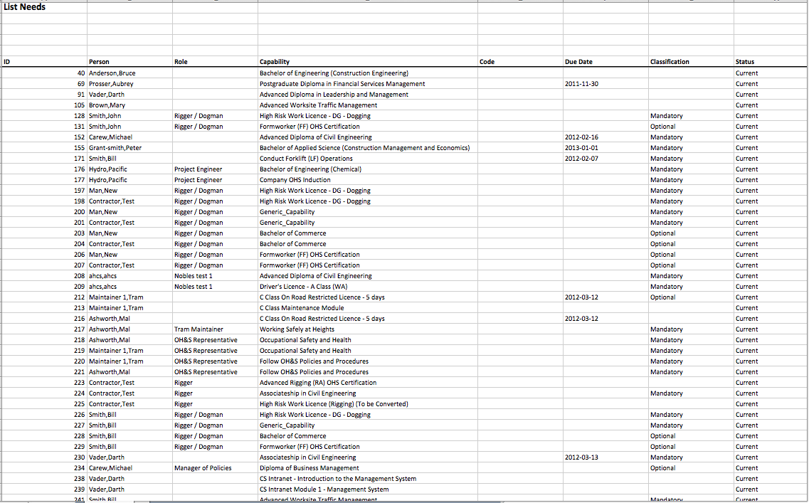 Training needs can be exported as an Excel list from the Needs menu. The report will reflect filtered search results as displayed on the lower half of the Needs page. This report is also available from the Reports menu.