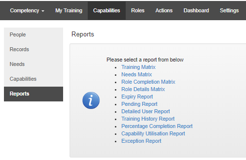 There are many different reports available from Lucidity Competency. They can be accessed via the relevant menus as outlined within this user guide (Records, Needs, Capabilities menu) or via the Reports page.