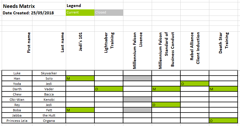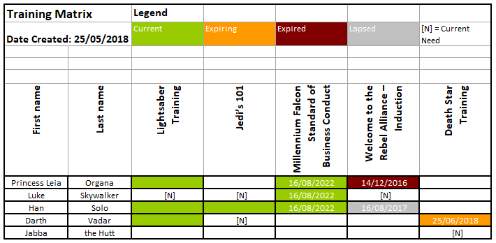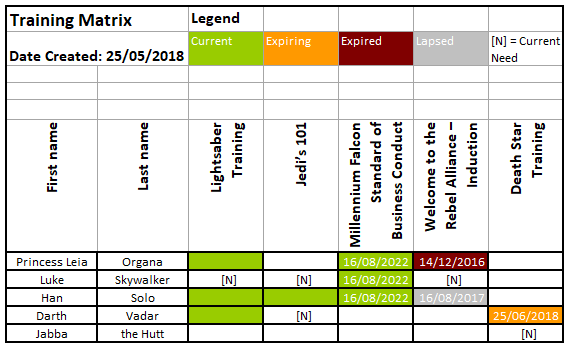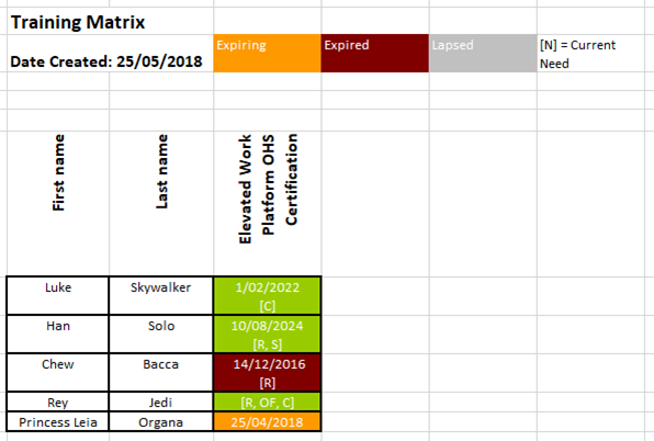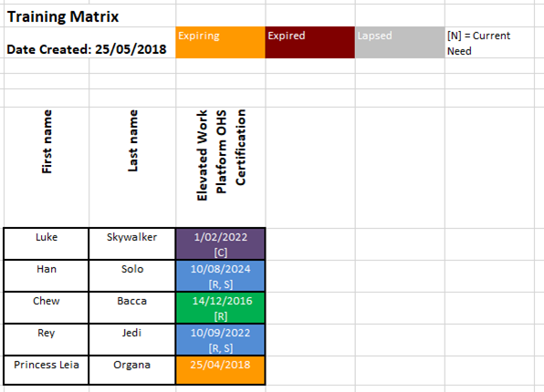 - Columns: Capabilities with color coding to show current, lapsed, expiring and expired records as well as outstanding needs.