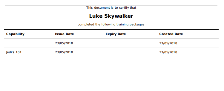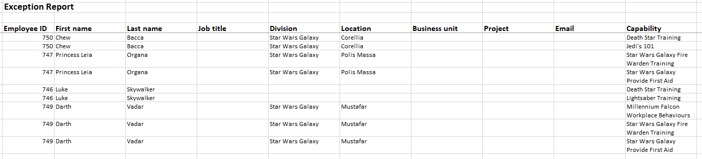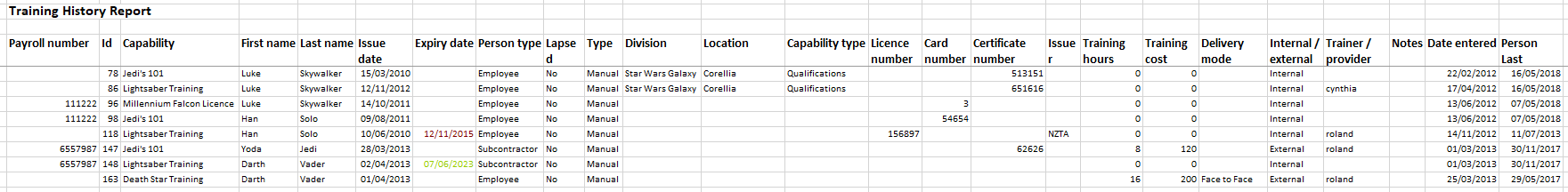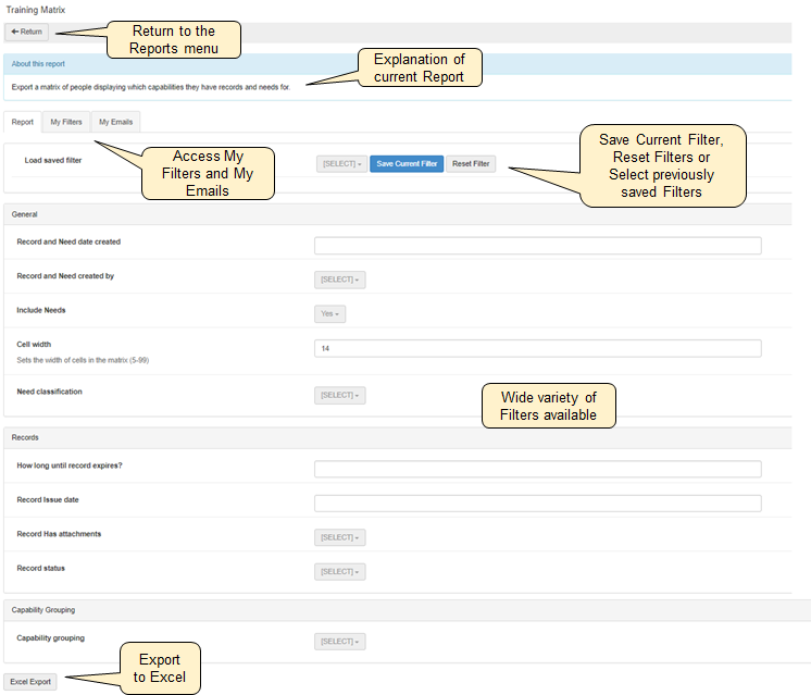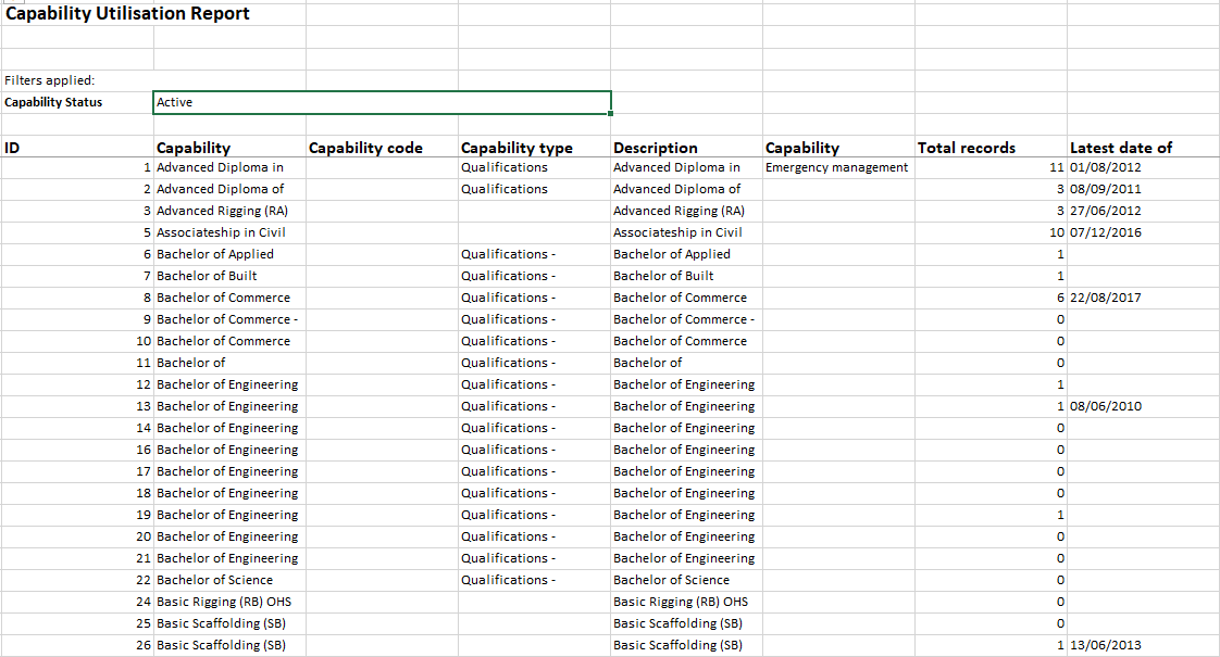 - Can be filtered using a range of options which vary depending on the type of report being used. Filter options may include project, division, capability, group, role and record status (expired, expiring, current).