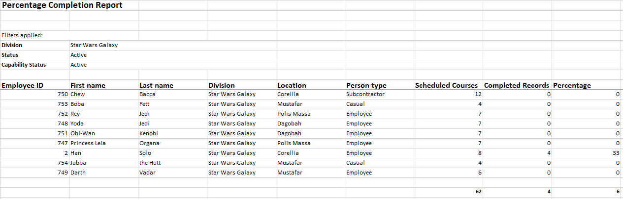 - Lists completion percentage rate of completed records vs scheduled courses.