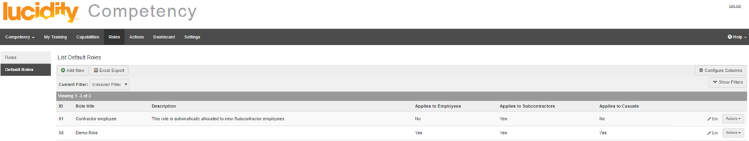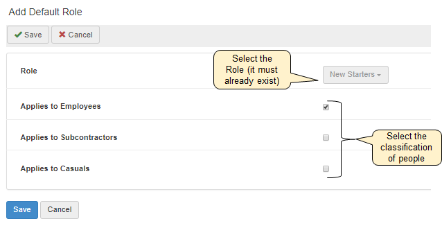 Default roles specify which (if any) roles are to be automatically added to any new users added to Lucidity HR. Since users can be classified as an employee, casual or subcontractor, there is the ability to specify separately which roles are automatically added for each classification of user.