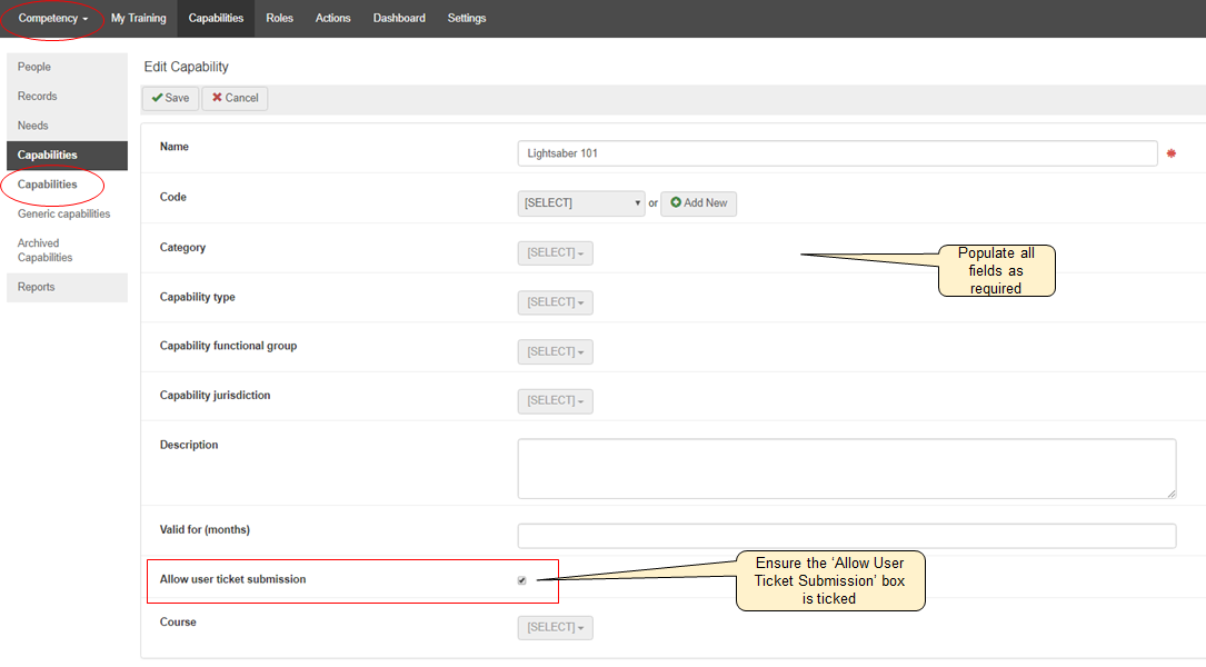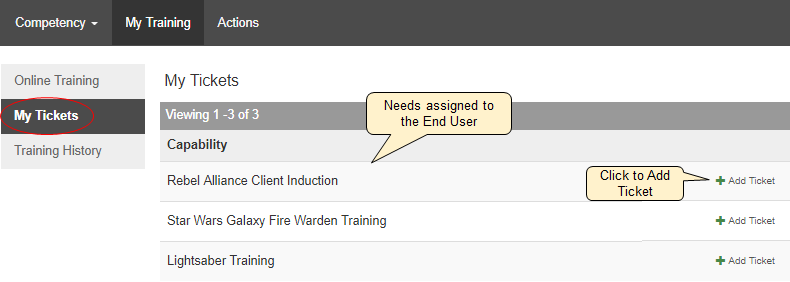 If the capability is linked to a Role for the end-user, a training Need will automatically be created, and a corresponding capability will be added into the My Tickets menu. This is the most common situation as Roles are the most efficient way to automate the training process.