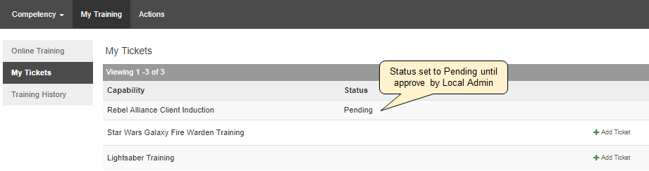 Submit required tickets as listed on the My Tickets page under the My Training tab. The submitted ticket will remain Pending until approved. |
