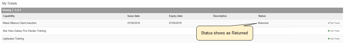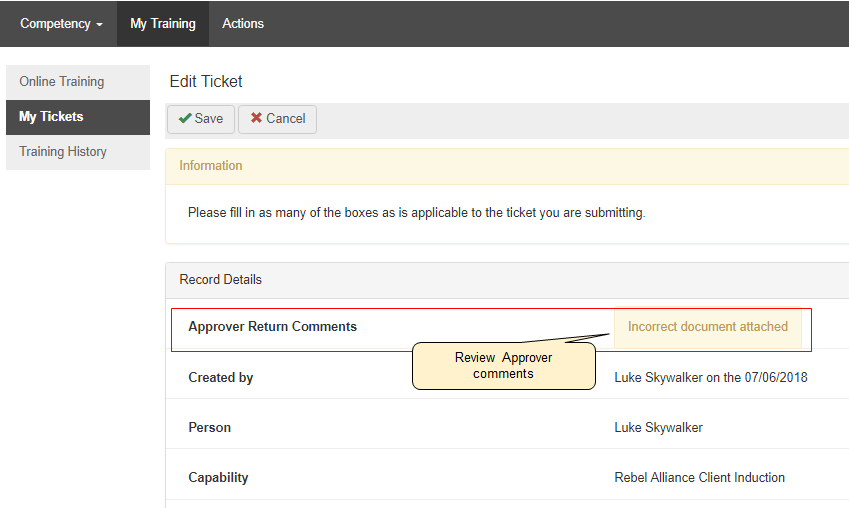 - Returned - If this option is selected, the local administrator must add a comment as to why the ticket is being returned, such as 'incorrect document attached.' This will then appear on the end-user's My Training and My Tickets page.