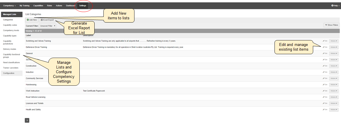 The Settings tab is only available to the system administrator and is where the drop-down lists that are available within the filters of Lucidity Competency are generated.