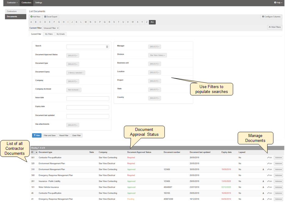 The Document page lists all required, returned, pending and approved documents associated with all contractor's in the system.