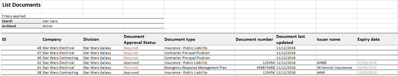 An Excel list report is available from the Documents page. Reports will reflect filtered search options as displayed on the lower half of the Document page.