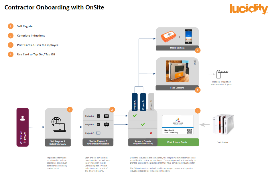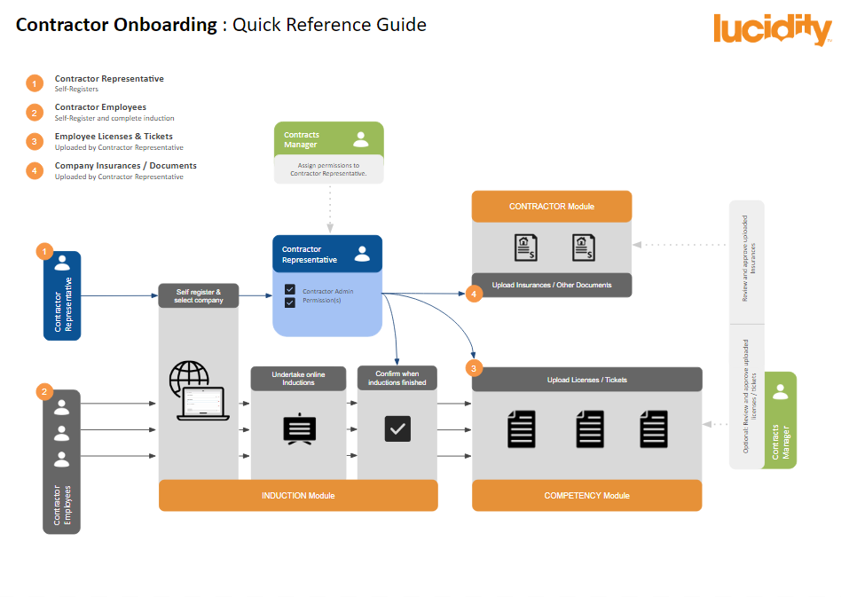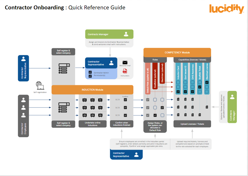 The Lucidity Contractor Onboarding Process Diagram provides a suggested process with additional details illustrating how Competency training roles can be used to manage contractor requirements.
