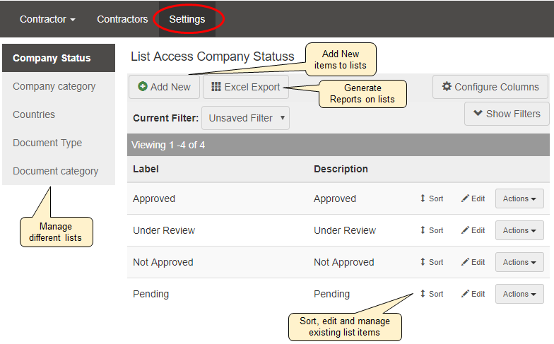 The Settings tab is only available to the system administrator and is where the drop-down lists that are available within the filters of Lucidity Contractor are generated.
