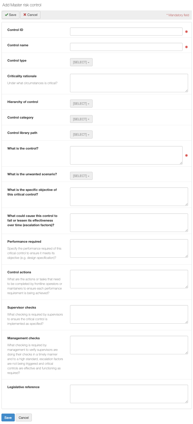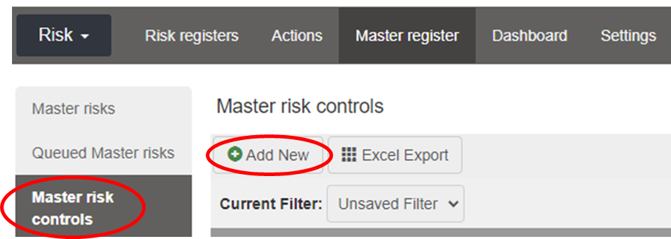 To add a master risk control, from the Master Register then Master Risk Controls menu: