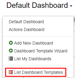 Administrators with appropriate permissions can access the dashboard template menu to create and modify templates from the dashboard selector: