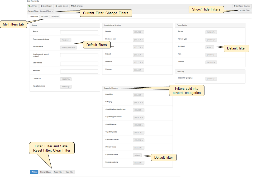 Filters are a powerful tool enabling general or very specific searches to be applied. Filters are available on any page within Lucidity Software where lists of records or results are shown, as well as for specific reports and dashboard settings.