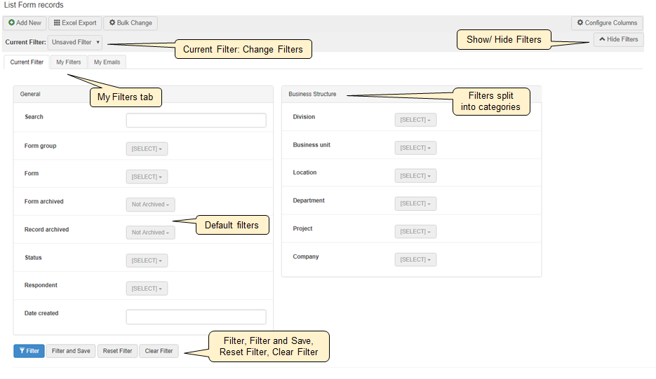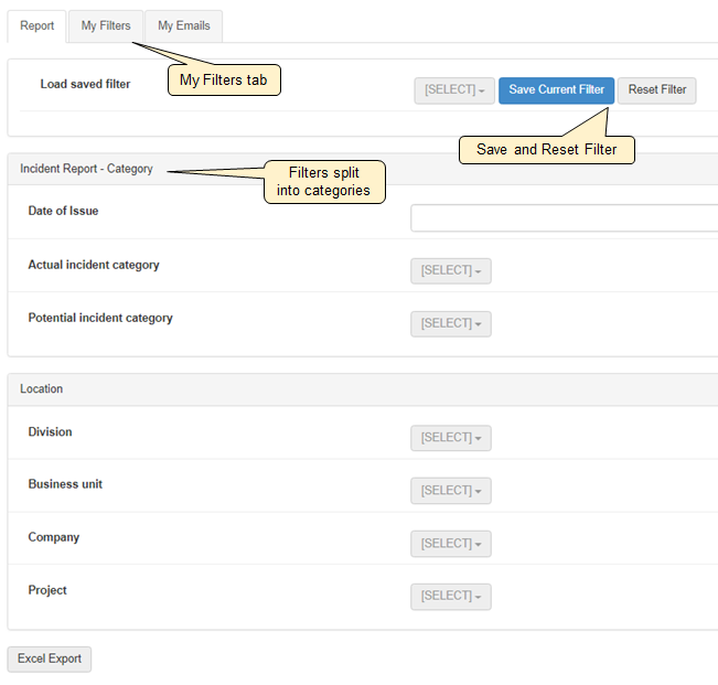 The My Filters functionality allows each end-user to save filtered reports. These can then be retrieved and run again at a later time, such as for monthly reporting or even set as a default filter.