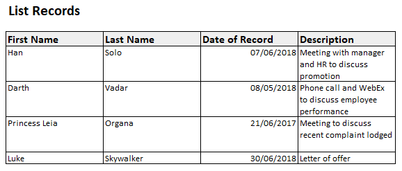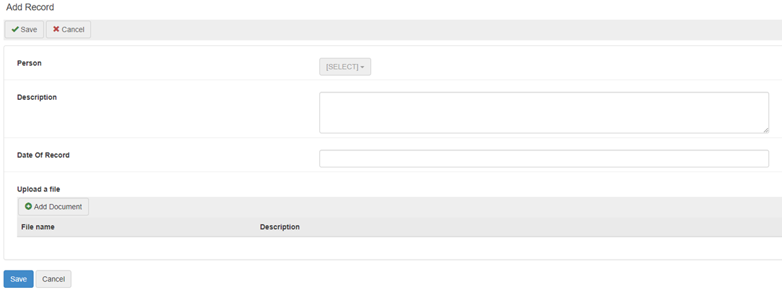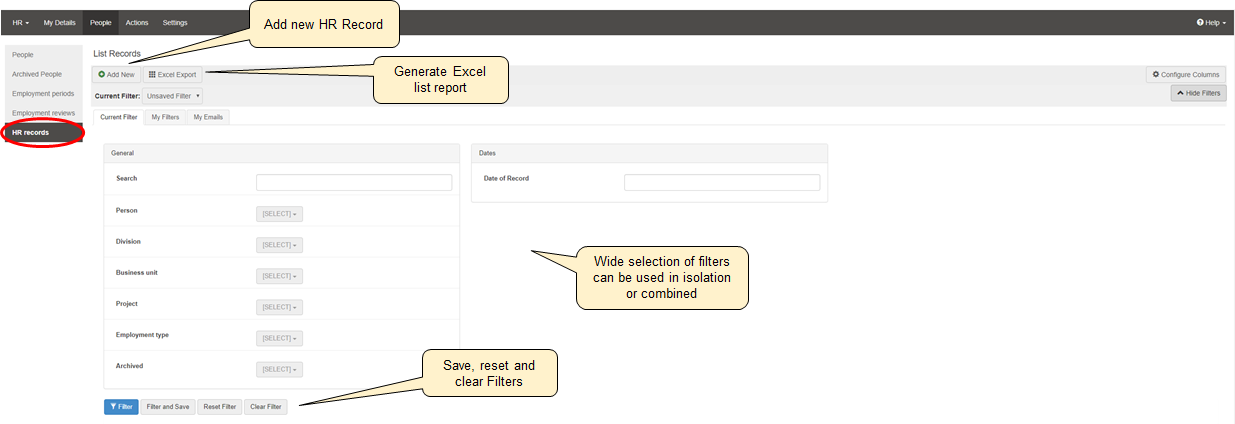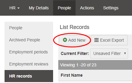 The HR Records page can be used for the tracking of various types of HR records such as letters of offer, meeting times and notes, employee complaints, promotions etc. HR documentation such as letters of offer, meeting notes etc can be uploaded against each record if required.