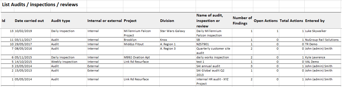 - Report on audits in Excel format