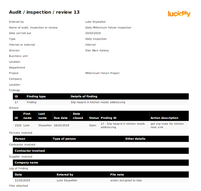 It is recommended the Audits tab within Lucidity Incident is used to capture details on external audits only. It is suggested that Lucidity InForm is used for capturing details of internal audits as all checklists can be managed and configured, actions captured and attachments saved, allowing for much more flexibility and business control.