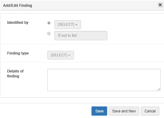 Click 'Save and Continue' to save data entered so far. Saving at this point also allows any actions entered to be linked to a finding created in the steps above |