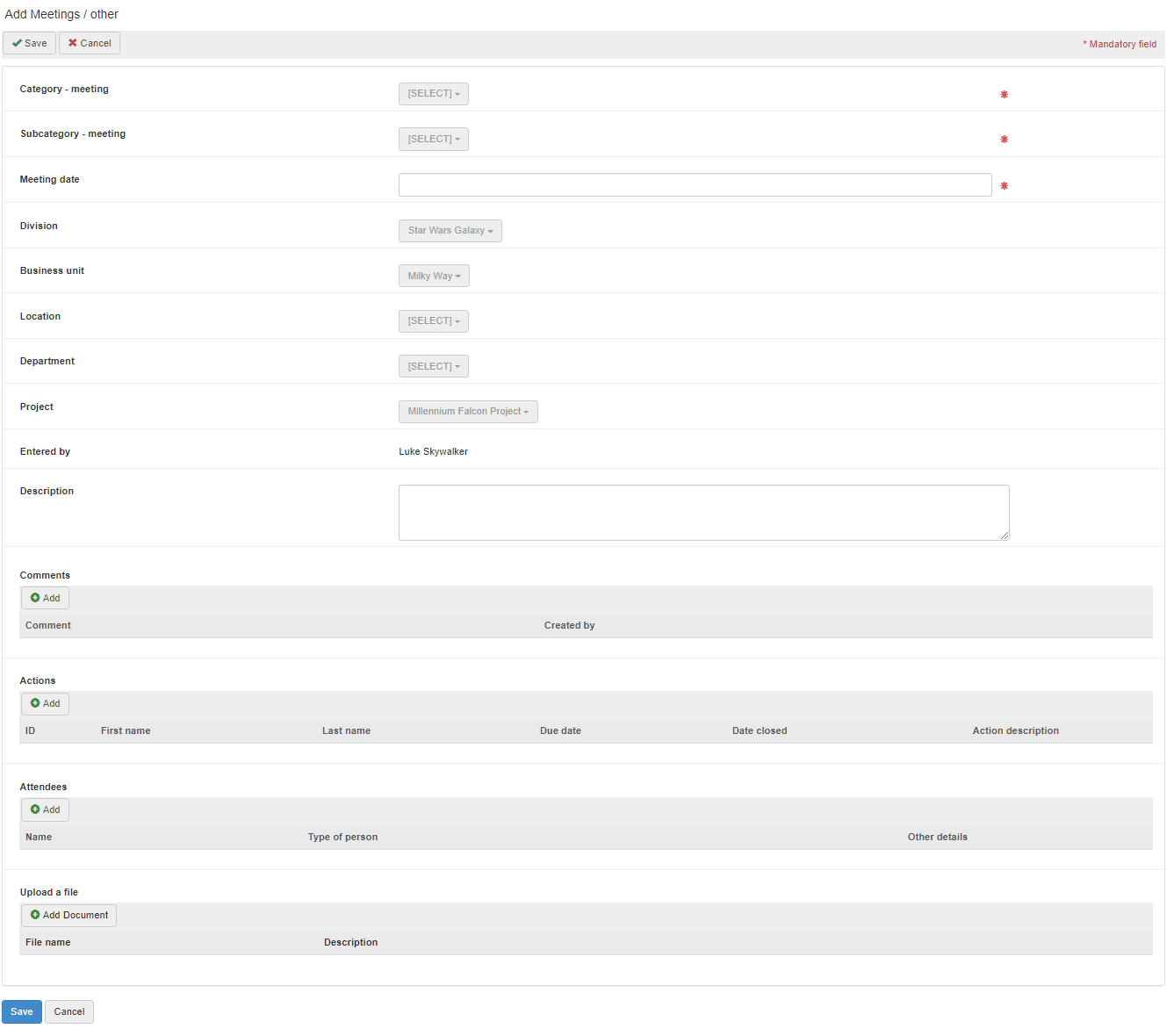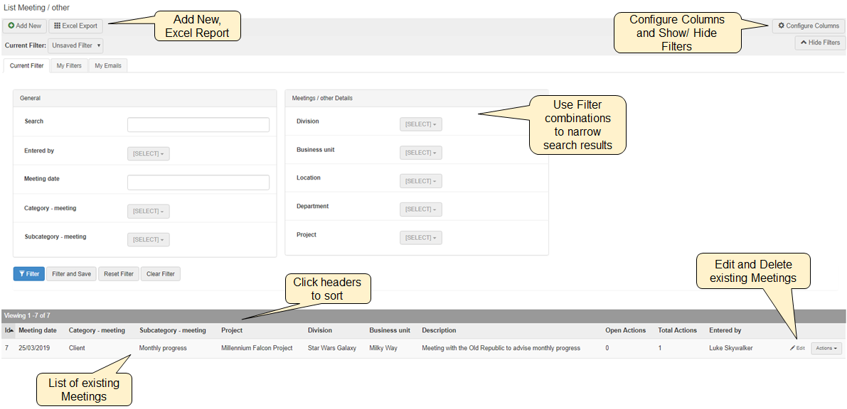 The Meetings tab can be used to record meetings and other similar events. This then allows the outcomes of the meetings to be captured within the action management system. Meetings can be classified according to a category and sub-category and against the organisation structure. Attendees can be recorded and the minutes attached.