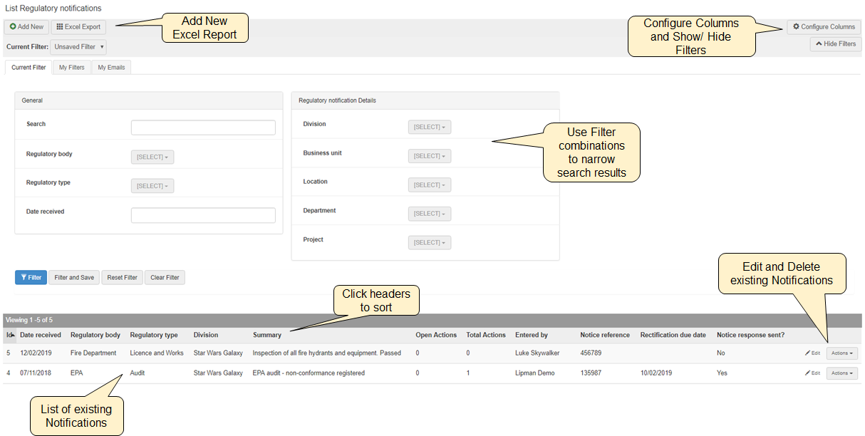 - Add, edit and delete regulatory notification details.