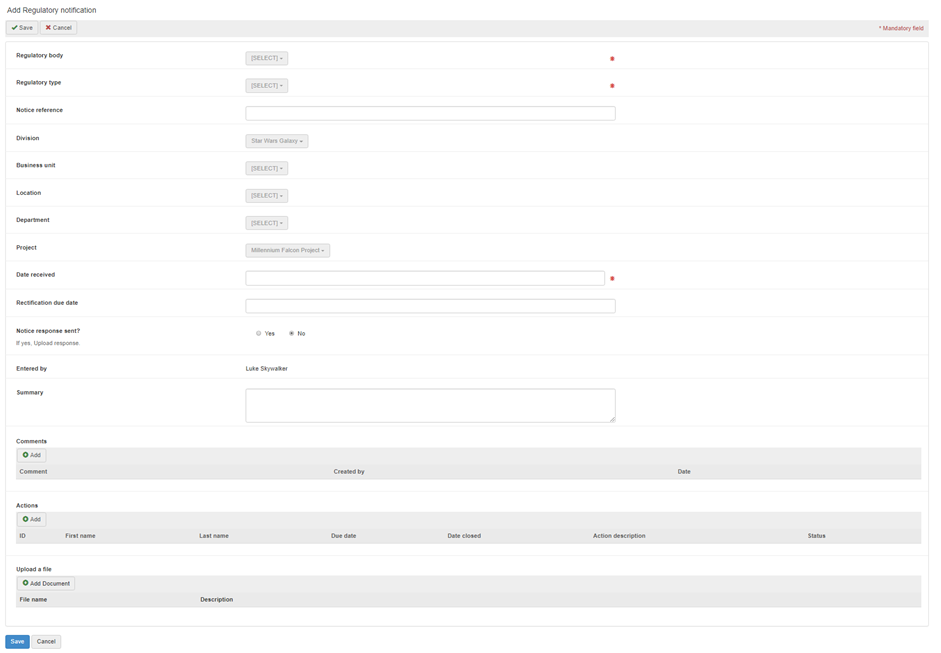 The regulatory notifications tab can be used to record correspondence received from regulators and other authorities.