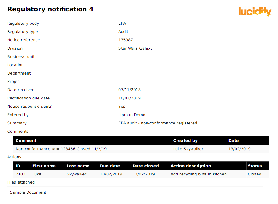 The Regulatory Notifications tab in Lucidity provides a dedicated space for recording and managing correspondence from regulatory bodies and authorities that is not directly related to specific incidents. This feature enhances an organisation's ability to track, document, and action regulatory communications, supporting comprehensive compliance management and efficient oversight of external correspondence.