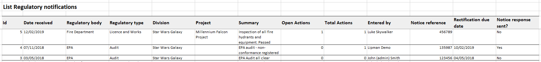 - Report on regulatory notifications in Excel format.