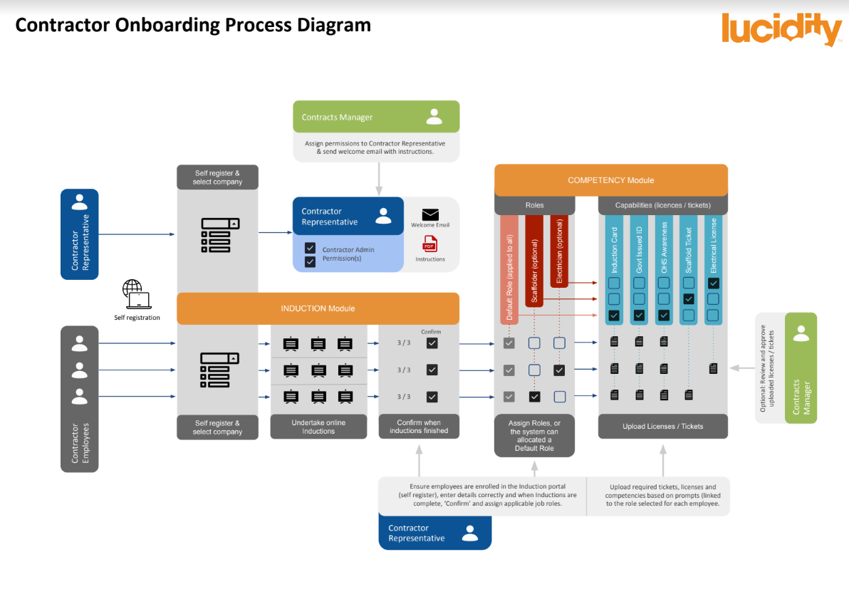Lucidity Induction is a powerful tool designed to streamline the onboarding process for both employees and contractors, offering a comprehensive platform for self-registration and eLearning. This guide will walk you through the basics of Lucidity Induction and provide insights into effectively managing contractor onboarding, helping you create a more efficient and user-friendly induction experience for your organisation. Please see Further reading for more information on Induction.