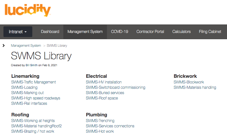 An example of a SWMS Library in Lucidity Intranet is included below.