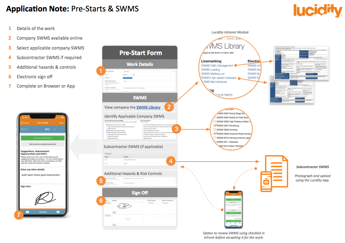The Application Note below summarises the process, using a Pre-Start form in Lucidity InForm as the key element to the workflow. Click the diagram to download a PDF.