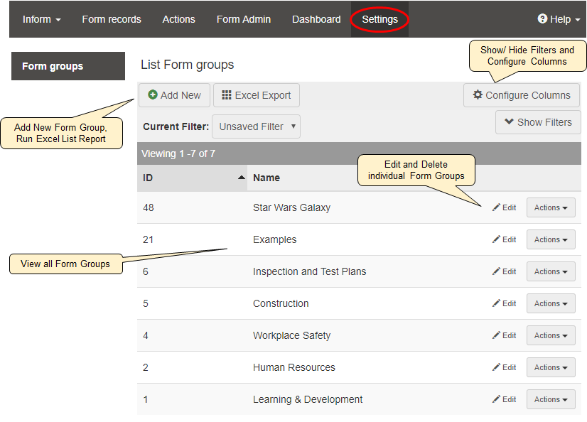The Settings tab is only available to the system administrator and is where the form groups that are available within Lucidity InForm are created and managed. Form groups are categories for filing forms and enables forms to be restricted to specific users or user groups via Lucidity Access.