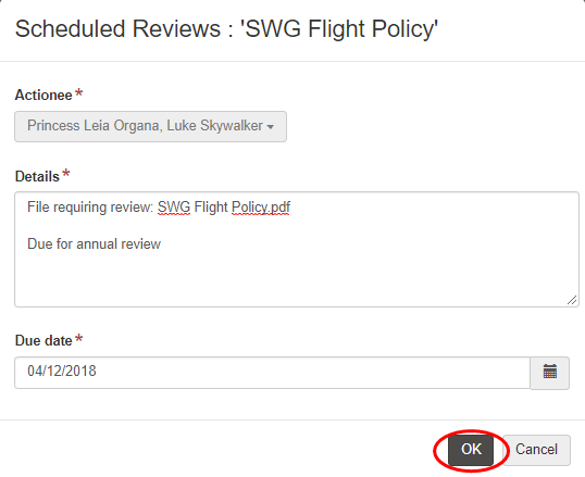 - Enter the details for the review and notes for the actionee(s).