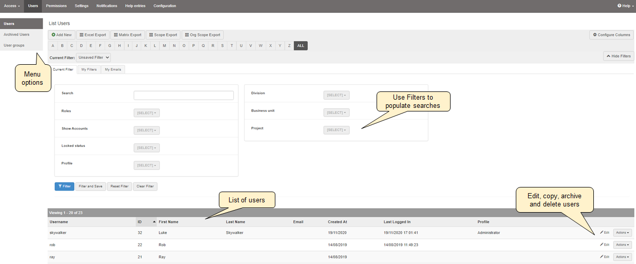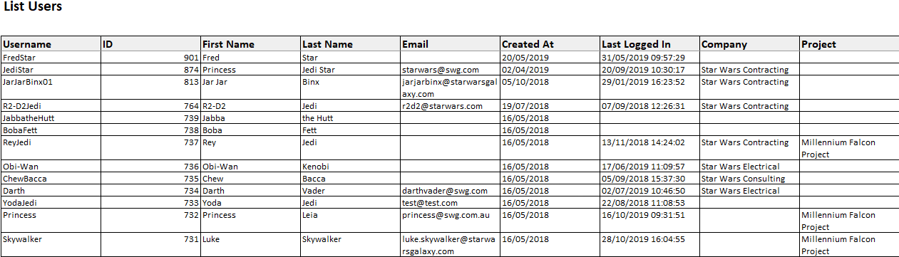 | Excel Export | A basic list report of user information | Users | Information about each user such as username, log in dates etc | |