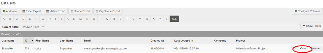 Use filters as required to locate the relevant user.